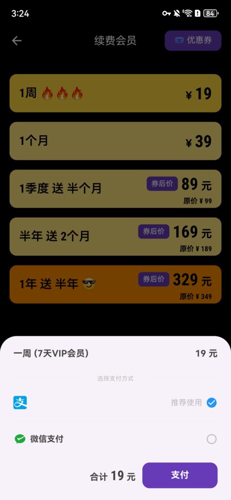 但不管怎样,如果你对于夜猫加速器的价格可以接受,并且也觉得该工具还算好用,那么我们也完全支持你购买它的会员,夜猫的会员也是只支持在 APP 应用里面买,付款方式有两种,支付宝付款以及微信付款,对大家来说也还算很方便的。